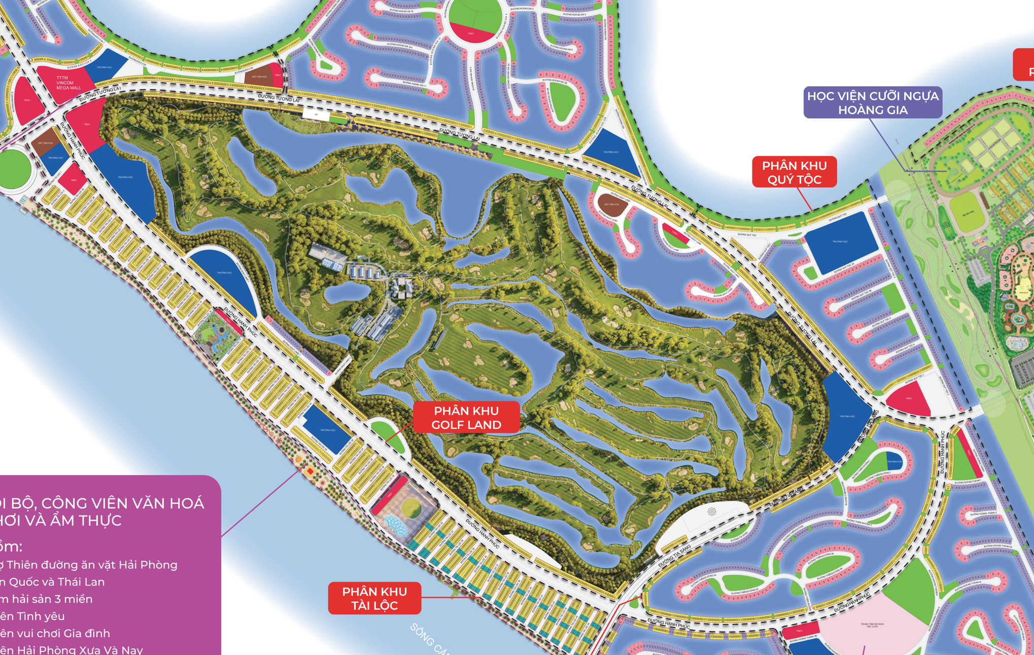 Golf Land là phân khu mà các sản phẩm tại đây nằm bao quanh sân golf Vũ Yên 36 hố, bao gồm Shophouse, biệt thự Song lập, biệt thự Đơn lập. Sân golf Vũ Yên nằm tại giữa dự án, đóng vai trò như một lá phổi xanh điều hòa không khí trên đảo. Do vậy, các sản phẩm bao quanh sân golf đều được sở hữu tầm view trực diện vào những thảm cỏ xanh, kết hợp với sông nước ngọt tự nhiên bên trong đảo. Đặc biệt, sân Golf tại đảo Vũ Yên có diện tích lên tới 160ha, được vận hành từ năm 2017 và là một trong những sân golf lớn nhất Việt Nam, được các Golfer được biệt ưa thích.